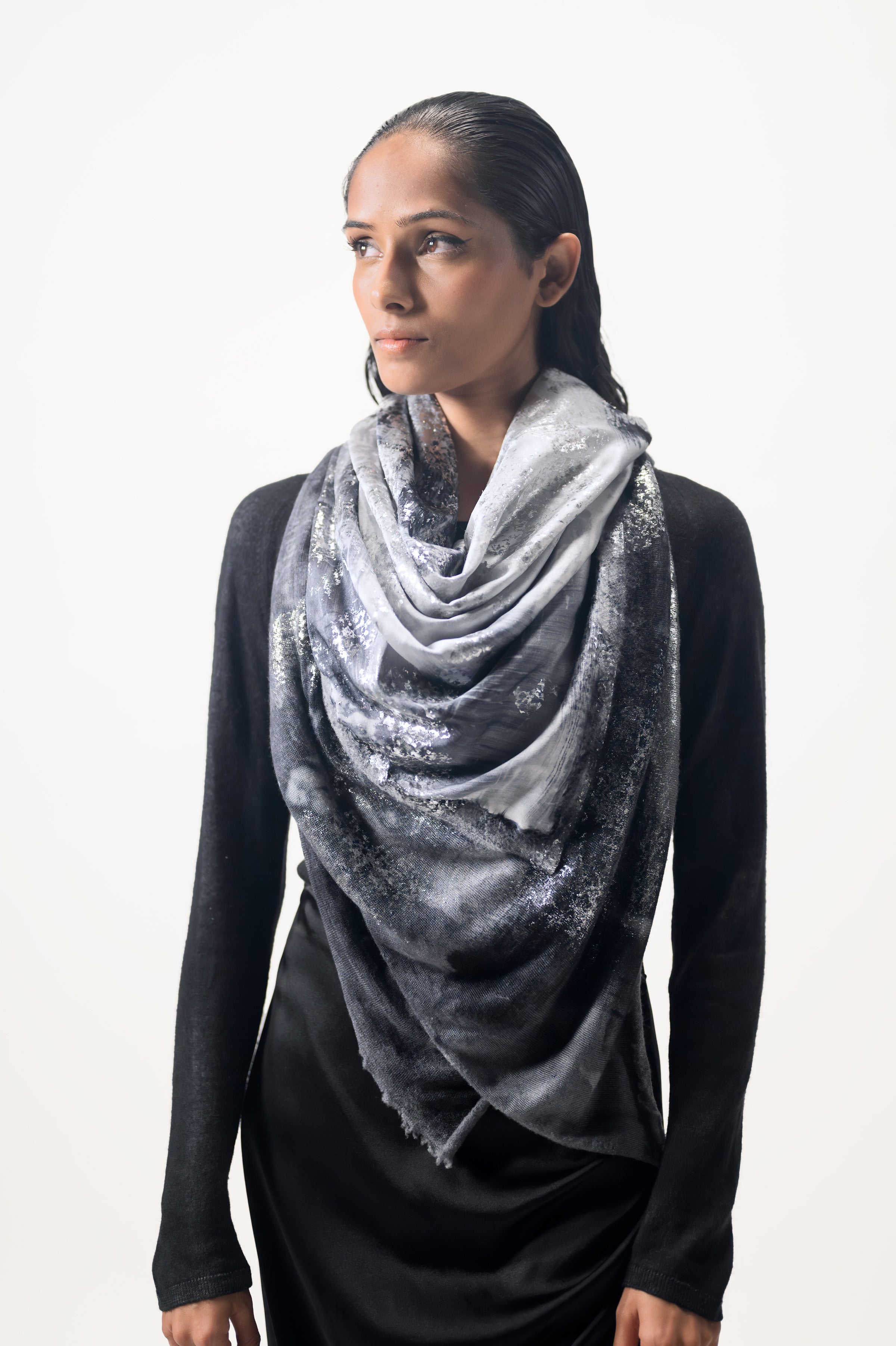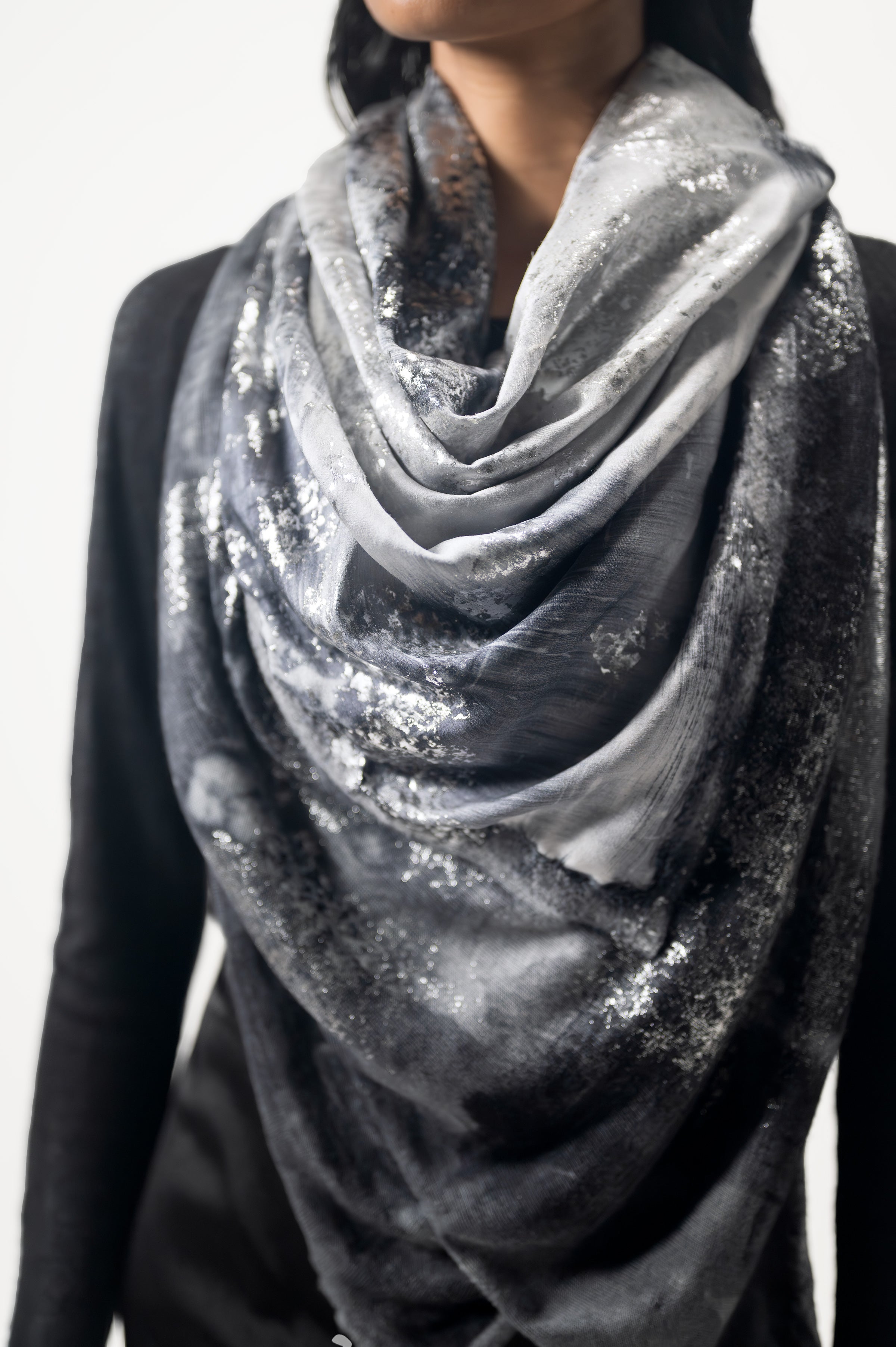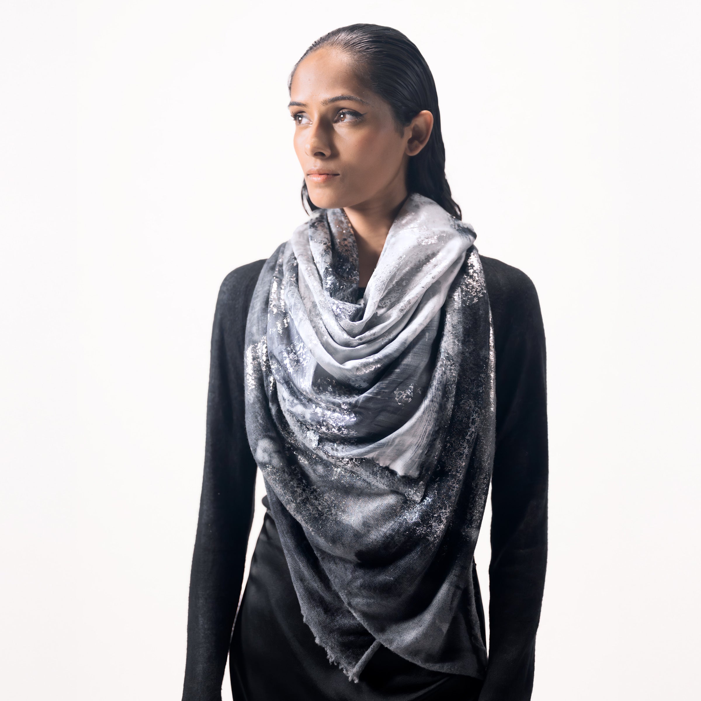 Una pregiata variante con lamina argento aggiunge al foulard una luminosità senza pari.