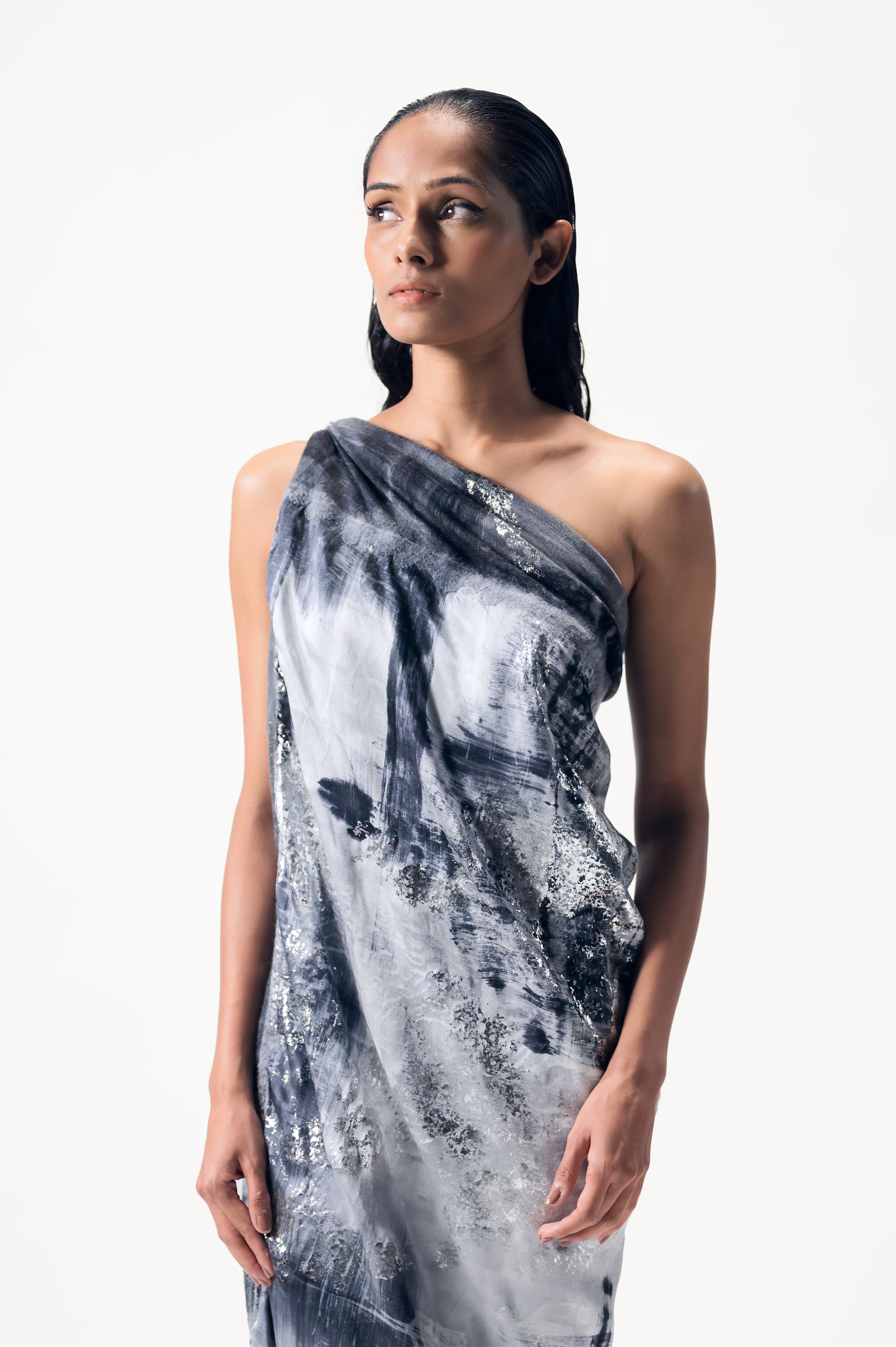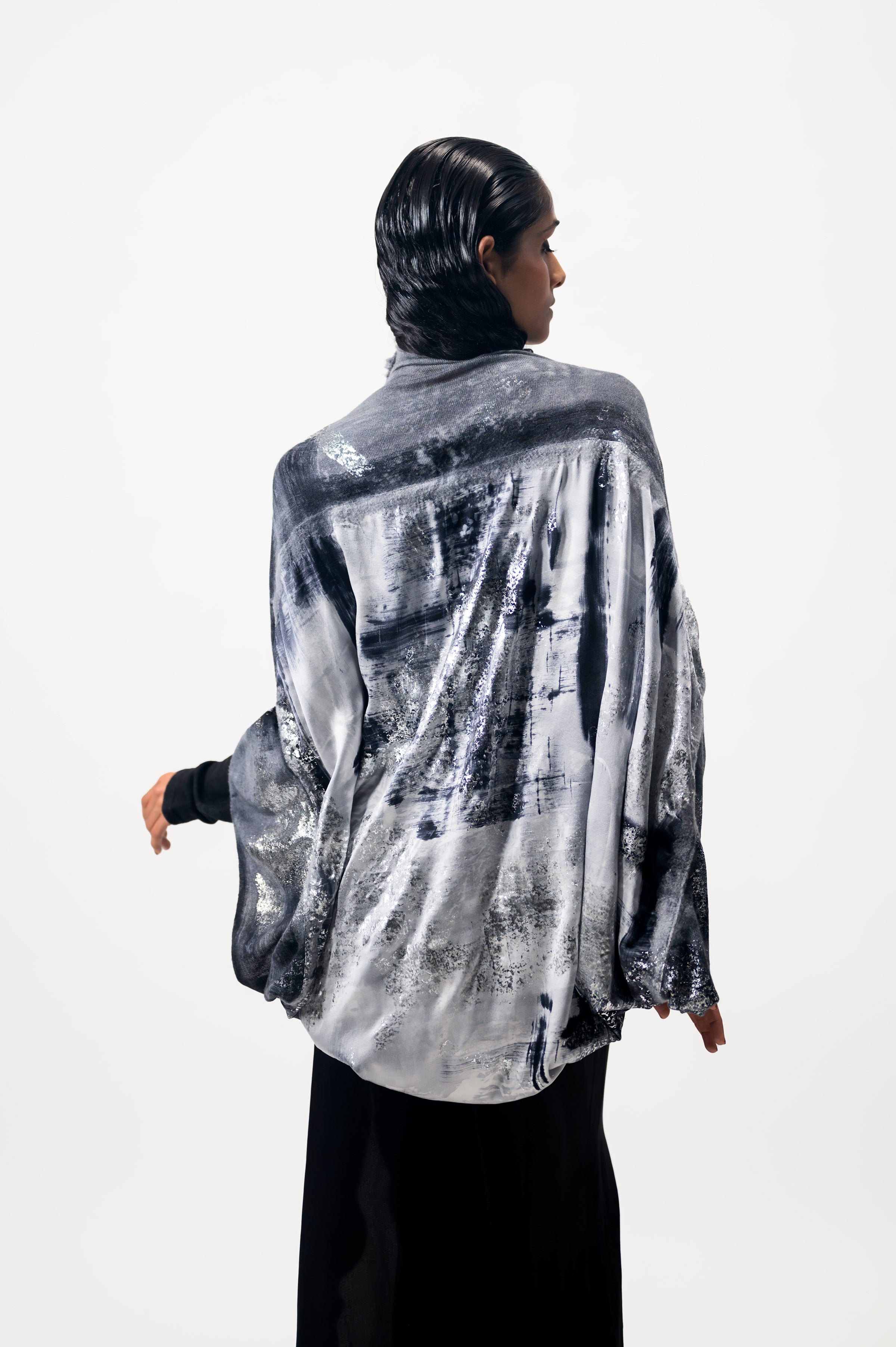Ogni tratto rivela l’arte e la cura dell’artigianato italiano, con un’esclusiva lavorazione pittorica eseguita totalmente a mano, dando vita a pennellate fluide nelle tonalità sofisticate del grigio, nero e bianco.